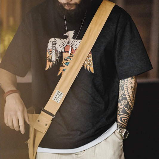 Vintage Boro Style Half-Zip Indigo Dyed Printed Short Sleeve Polo Shirt