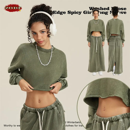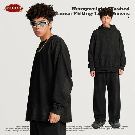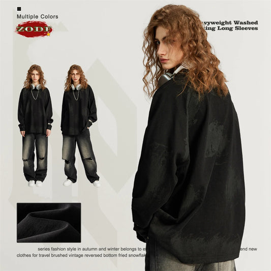 ZODF Loose 420gsm Terry O Neck Batik Washed Cotton Sweatshirt