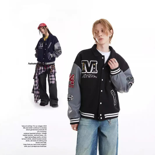 American Alphabet Embroidery PU Leather Sleeve Jacket